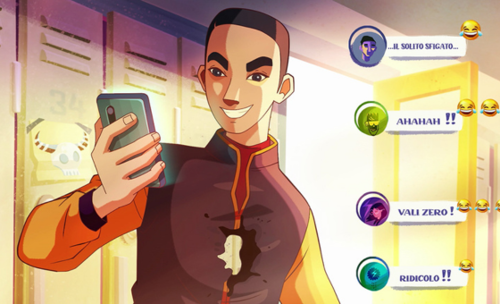Poi viene inquadrato il bullo che ride soddisfatto. Poi guarda in giù e vede che qualcosa non va: il suo corpo non è più intero perché ha un buco al posto del cuore. Si spaventa e quando si tocca sente il vuoto e capisce. Quindi prende il telefono, apre il post e preme “Elimina”.