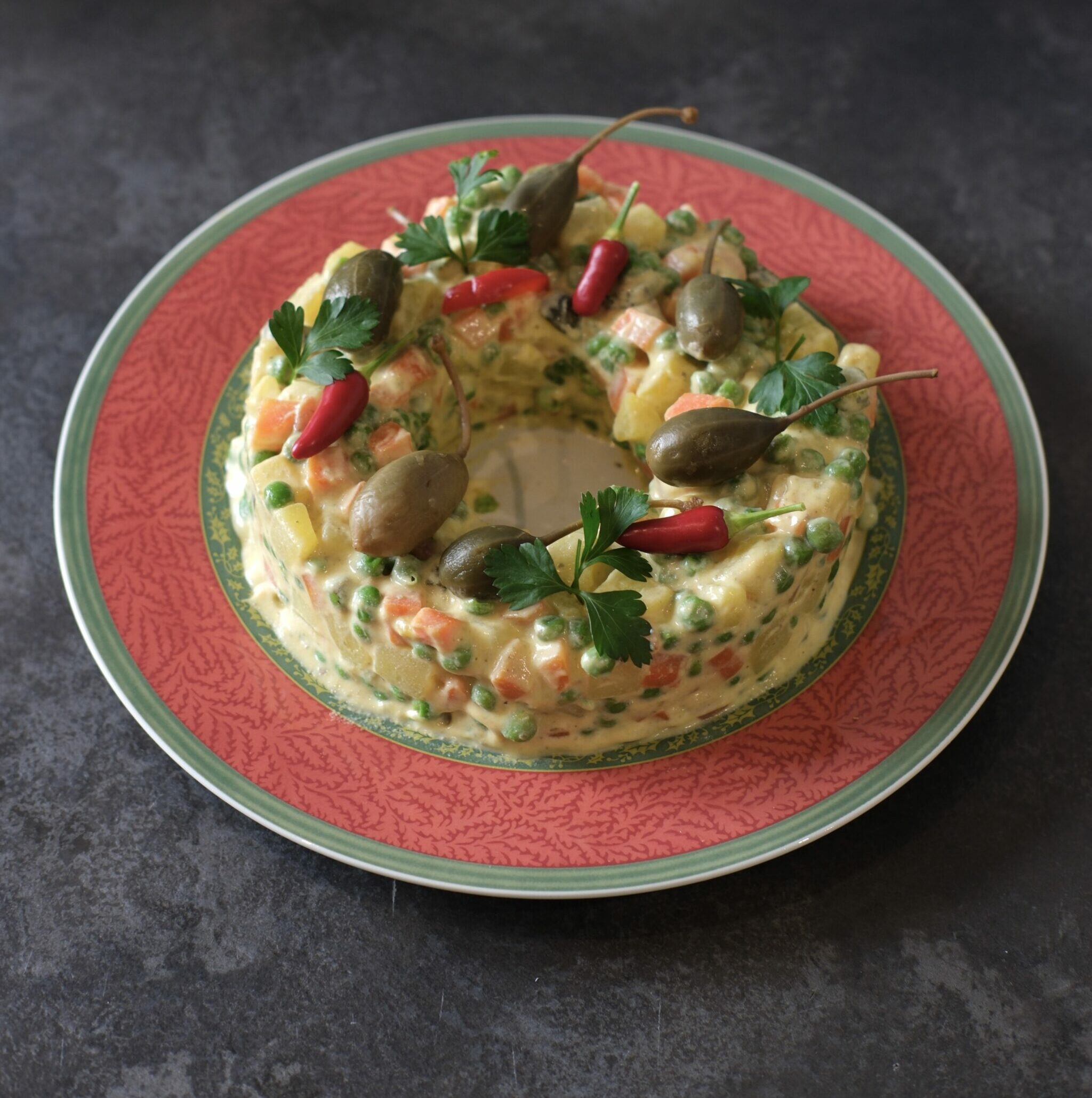 Disponi l’insalata russa su un piatto da portata, modellandola a forma di ghirlanda, e decora a piacere. Lascia riposare in frigorifero fino al momento di servirla.