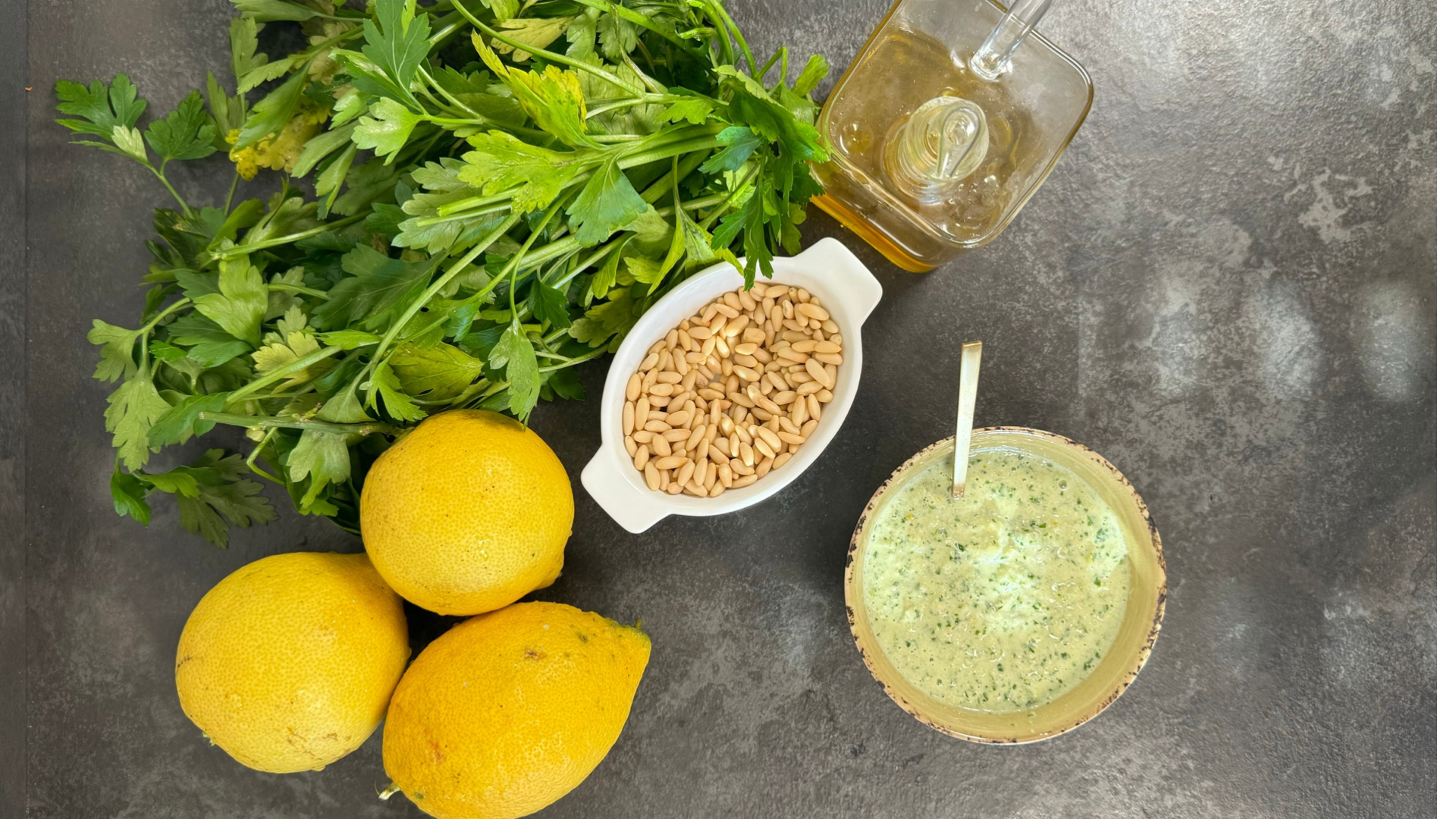 Questa versione del pesto di limoni è realizzata utilizzando la polpa del limone, una piccola parte della scorza (senza la parte bianca amara), foglie e gambi di prezzemolo fresco, olio extravergine di oliva, sale e una manciata di pinoli. Tutti gli ingredienti vengono frullati a crudo, in questo modo mantengono intatte le proprietà nutritive.